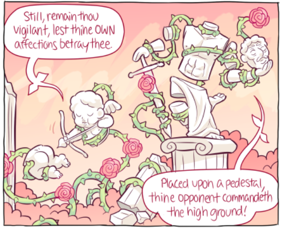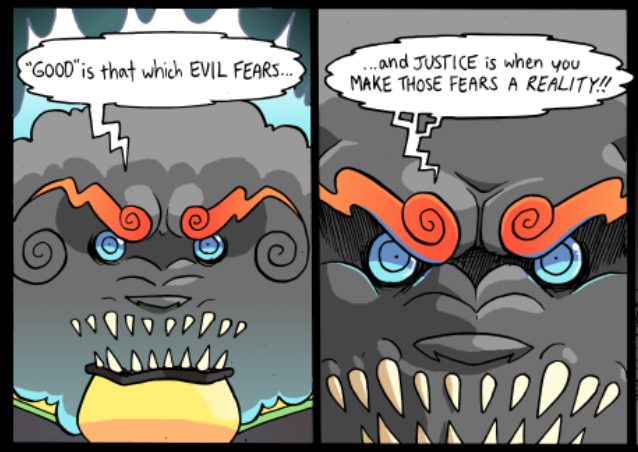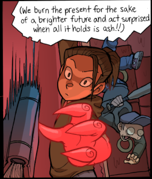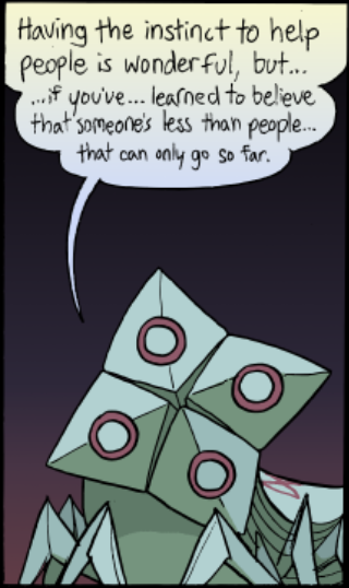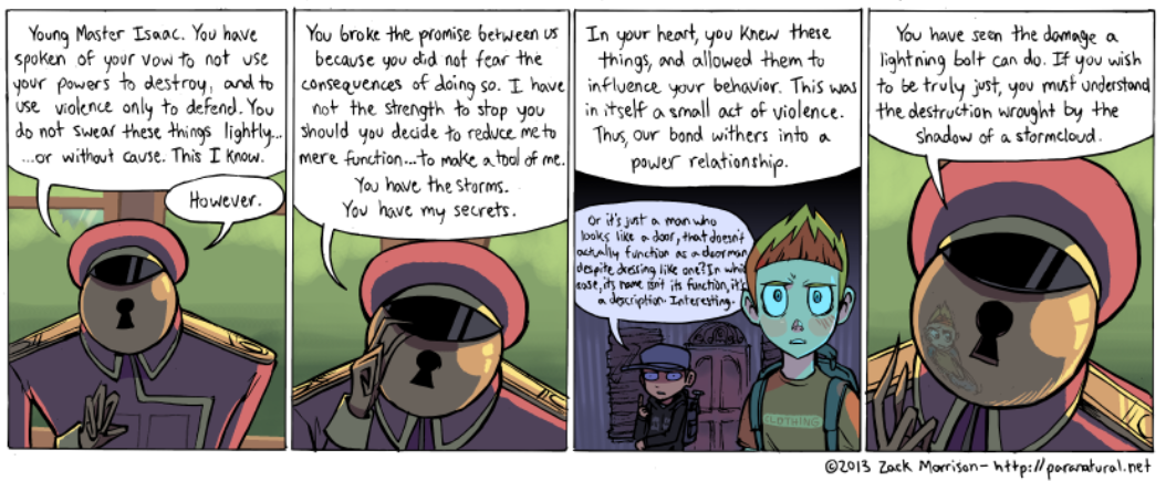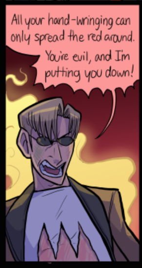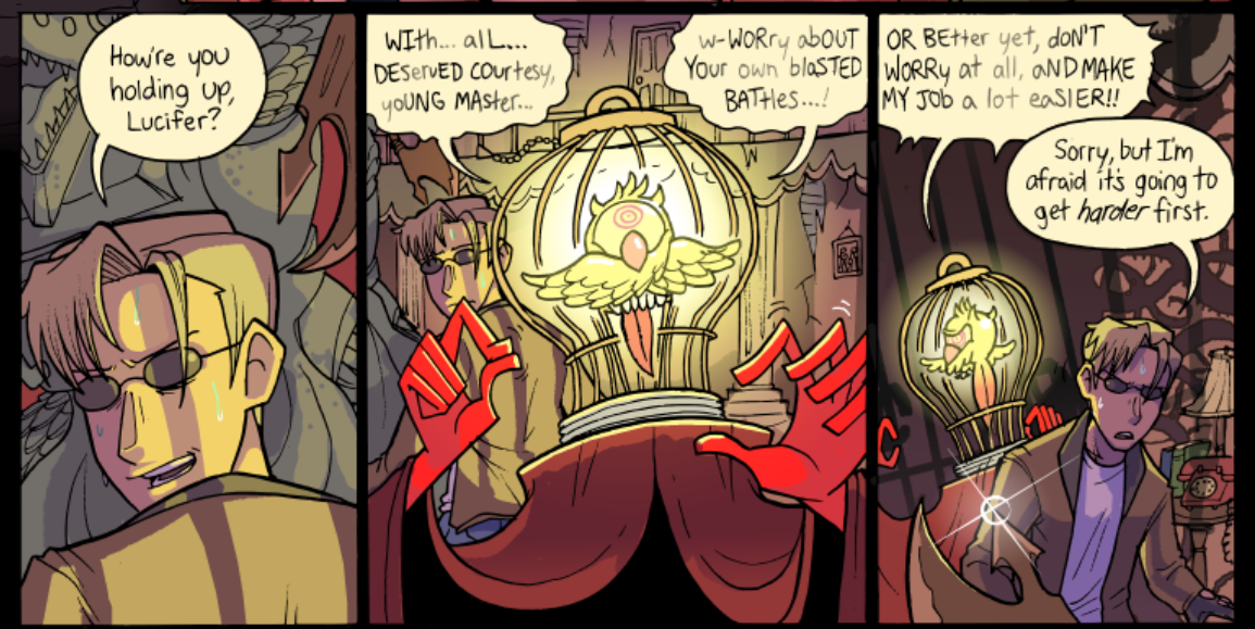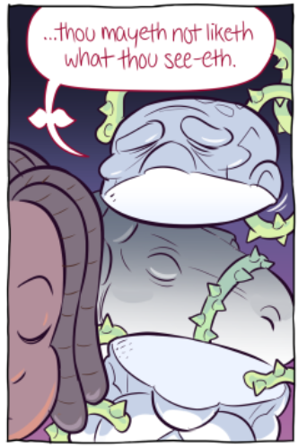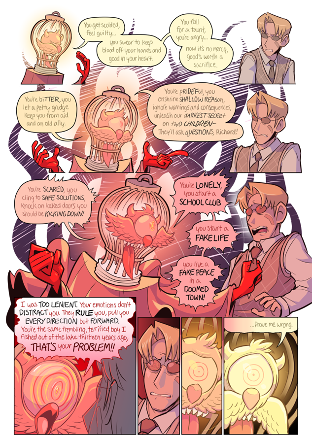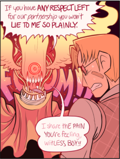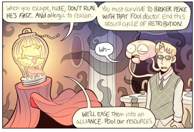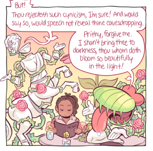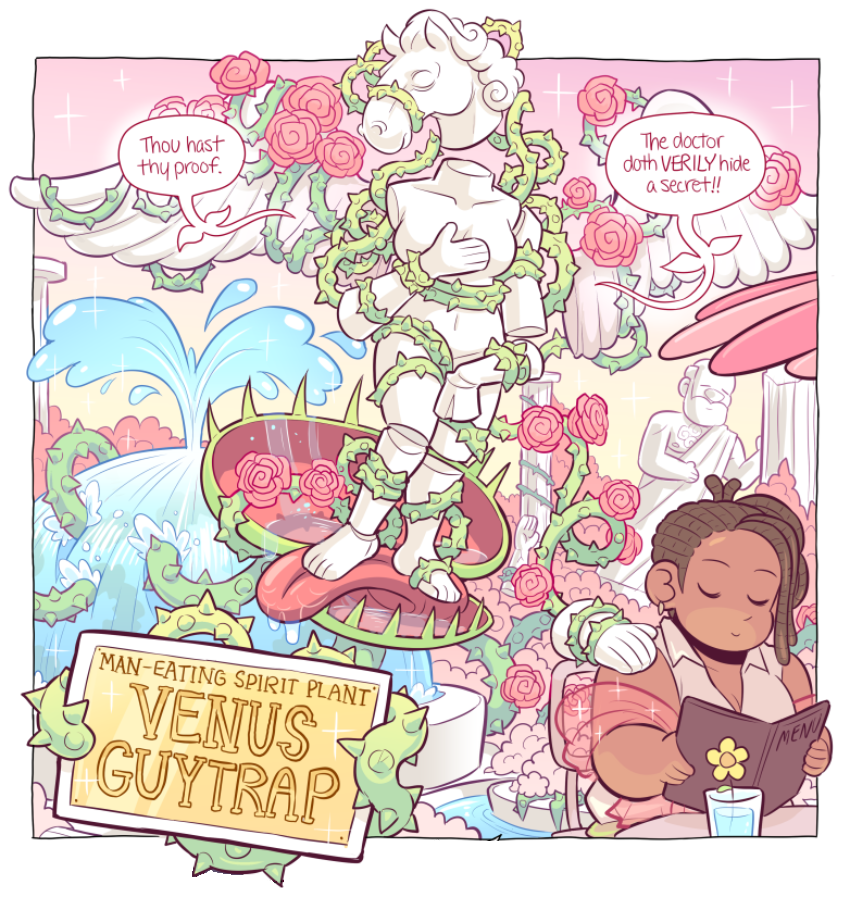 Venus has only appeared in one scene (though their presense has been felt in others) but their one scene had me just enraptured. I absolutely adore the design, though 'concept' might be a better word for Venus' constantly shifting apperance. One of Paranatural's strengths are the incredible designs of the spirit characters, who often have two or three or four integrated visual concepts at once (standout examples are Cryptide and Lucifer). But Venus Guytrap just smacked me from the first page; I was rapt waiting for every update during this scene (for more than one reason). I love Venus' pink, rosy, gentle, ever-changing, subtly threatening world.