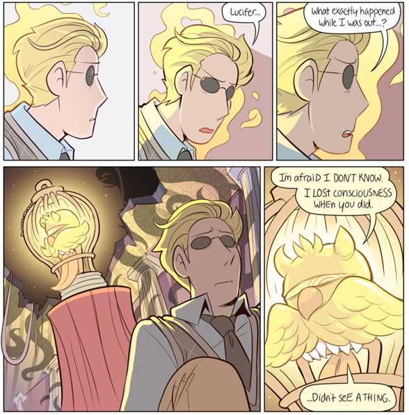 The way Lucifer talks about respect and then goes behind his back... If you don't want to see it as actual disdain, you have to see it as sheer dissapointment. The best light in which I can see this treatment is that Lucifer is desperately trying to keep some hope for Richard alive, is purposefully tending his guttering affection for his pupil, and is trying to keep his utter conviction that Rick is a failure to himself because despite everything, he doesn't want to hurt that idiot kid any more... and he needs his body to keep the Shadow in pirson.